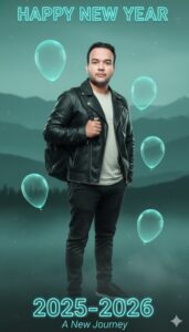 Create a hyper-realistic cinematic portrait using the uploaded photo as the main reference, and make sure the face matches the uploaded image exactly same to same with no changes in facial structure, skin tone, beard, hairstyle, or expression. The person is standing confidently in the center in a full-body pose, wearing a black leather jacket over a light t-shirt and casual pants, holding a backpack strap on one shoulder. The background should be a moody teal-green cinematic landscape with soft fog, distant mountains, and a dreamy atmosphere, with glowing teal balloons floating around for a New Year celebration vibe. Add glowing neon text at the top saying “HAPPY NEW YEAR”, and at the bottom center bold glowing text “2025–2026” with smaller text below “A New Journey”. Use soft cinematic lighting, realistic shadows, shallow depth of field, ultra-HD DSLR quality, professional color grading, realistic skin texture, no cartoon effect, no blur, premium social-media poster look, and render the final image in vertical 9:16 aspect ratio.