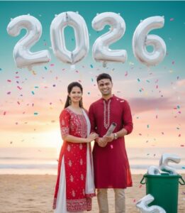 A hyper-realistic 8K cinematic portrait of the couple (using the same face match as reference images) standing on a sandy beach during a vibrant sunset. They are facing the camera with gentle smiles, wearing coordinated festive red and white ensembles suited for a New Year celebration. Hovering brightly above them are large white foil balloon numbers reading '2026'. On the sand beside them sits a green dustbin containing the discarded past: crumpled white balloon numbers '202' are stuffed inside, with a single '5' white balloon lying neglected near the bottom. The man holds a silver confetti cannon, and the air is filled with falling colorful confetti. The scene is illuminated by soft, glowing golden hour light against a stunning teal and pink gradient sky, rendered with deep cinematic bokeh. Image should be in vertical aspect ratio 9:16.