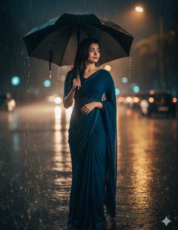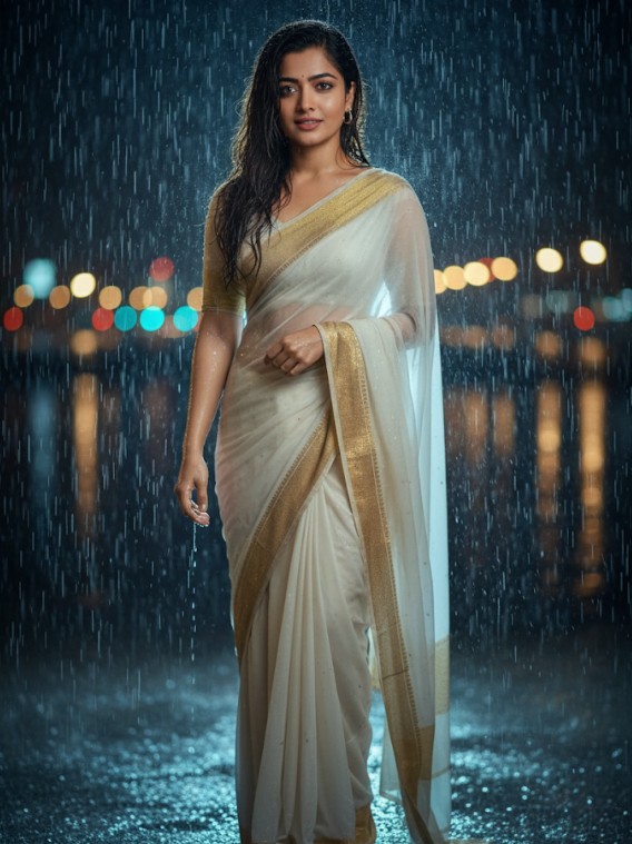 “Create a hyper-realistic 4K portrait of me standing outdoors at night, in the rain, wearing a pure white chiffon saree with a golden border. My face should remain exactly the same as in my photo, with wet hair, natural skin texture, and a soft confident expression. Add a cinematic background with blurred city lights (bokeh effect), raindrops clearly visible, and dramatic lighting that enhances the saree and the overall mood. Style should look like a professional photography photoshoot with high detail and emotional depth.”
