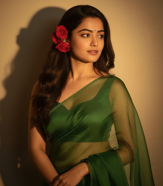 “Convert, 4k HD realistic, A stunning portrait of a young Indian woman with long, dark, wavy hair cascading over her shoulders. She is wearing a translucent, elegant green saree draped over one shoulder, revealing a fitted blouse underneath. Red rose flowers are tucked behind her right ear. She is looking slightly to her right, with a soft, serene expression. I want same face as I uploaded no alternation 100 percent same. The background is a plain, warm-toned wall, illuminated by a warm light source from the right, creating a distinct, soft-edged shadow of her profile and hair on the wall behind her. The overall mood is retro and artistic.”