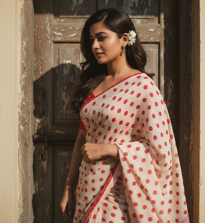 “Create a retro, vintage-inspired image — grainy yet bright — based on the reference picture. The girl should be draped in a perfect off white cotton saree with red polka dots on it, Pinterest-style aesthetic saree. The vibe must capture the essence of a 90s movie dark brown-haired baddie, with silky hair and a small flower tucked visibly into her hair, enhanced by a windy, romantic atmosphere. She stands against an old wooden door, where deep shadows and dramatic contrasts add mystery and artistry to the scene, creating a moody yet enchanting cinematic effect. Make a pose like she is adjusting her saree.”
