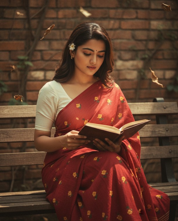 “Create a retro, vintage-inspired image – grainy yet bright – based on the reference picture. The girl should be draped in a perfect red cotton saree with small yellow flower prints, paired with a white blouse with sleeves above the elbow, styled in a Pinterest-inspired aesthetic. The vibe must capture the essence of a 90s movie dark-brown-haired baddie, with silky hair and a small flower tucked visibly into her hair, enhanced by a windy, romantic atmosphere. She is sitting on a wooden bench as a few leaves blow in the air, while dramatic contrasts add mystery and artistry to the scene, creating a moody yet enchanting cinematic effect. Her pose should suggest that she is reading a book.”