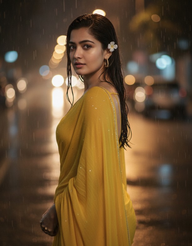 “Using the face from the provided reference image, create a cinematic, moody, and enchanting image of a young woman. She is standing in the rain, looking directly over her shoulder at the viewer with a subtle yet captivating expression. She is draped in a flowing yellow saree, the fabric appearing slightly wet and clinging, with delicate sparkling details. Her long, dark hair is wet and slicked back, with a small, white flower tucked behind her ear. She is wearing gold earrings. The background features a blurred, dark street scene with atmospheric streetlights creating bokeh effects, enhancing the dramatic and romantic atmosphere. The overall lighting is dim, emphasizing the glow of the streetlights and the texture of the rain.”
