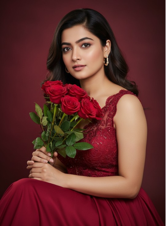 “A woman in an elegant gown, sitting gracefully while holding fresh red roses close to her face. She has long, wavy dark hair and a soft, elegant smile. Her facial features should precisely reflect this description with a calm and serene expression. The background is a smooth gradient of deep red, complementing the romantic atmosphere. Ensure the lighting has a cinematic quality, with high resolution and ultra-realistic details. The face should have an impeccable match with the description: soft yet confident, exuding warmth and elegance. Studio lighting should highlight her features, creating a soft, refined look.”