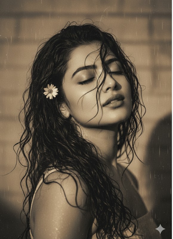 “Create a retro vintage rainy, grainy but white image of the reference picture. It must feel like a 90s curly wet hair baddie with a small flower tucked visible into her curls and romanticizing windy and rainy environment. The girl is standing with eyes closed and a sassy look, creating a mysterious and artistic atmosphere where the lighting is warm with golden tones, evoking a sunset. The background is minimalist and slightly textured. The expression on her face is moody, calm, yet happy and introspective.”