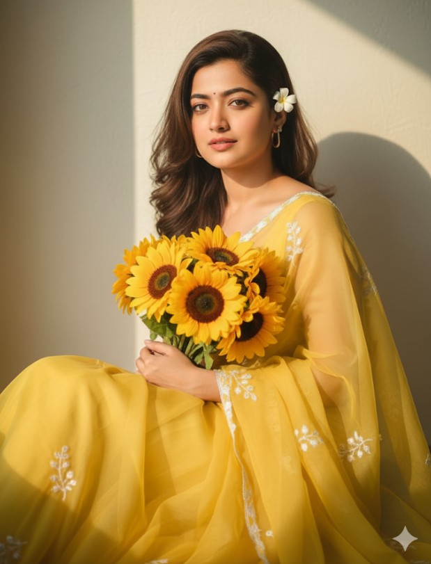 “Create a soft, sunlit portrait of your face, wearing a flowing sheer yellow saree with delicate floral embroidery. She sits gracefully against a plain wall, bathed in warm natural light with a triangular patch of sunlight casting artistic shadows. She holds a vibrant bouquet of sunflowers close to her chest, and a small white flower is tucked behind her ear. Her gentle expression, loose hair strands moving slightly, and the dreamy golden glow create a serene, poetic, and romantic atmosphere.”