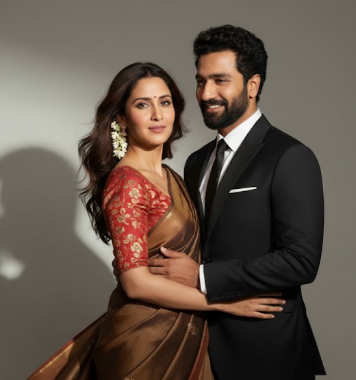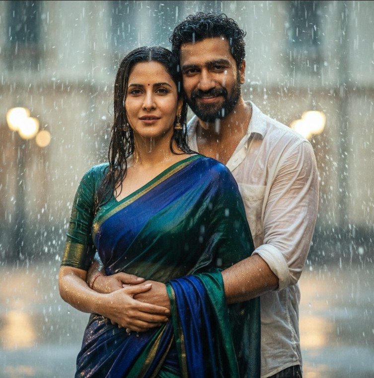 Keep the faces exactly the same as the uploaded photos for originality. The girl is wearing a beautiful saree, fully drenched, with natural wet-look details and raindrops on her skin and fabric. She is looking forward with a soft, romantic expression. The boy, wearing a soaked white open shirt, is standing slightly behind her, gently holding her by the waist, creating an intimate and protective pose. Both are smiling and enjoying the rain moment with love and warmth. The atmosphere should be cinematic: visible raindrops, water glistening on clothes and skin, soft blurred background with glowing streetlights or a dreamy backdrop. Make the overall scene intimate, romantic, vibrant, and full of emotions — like a Bollywood rain sequence.