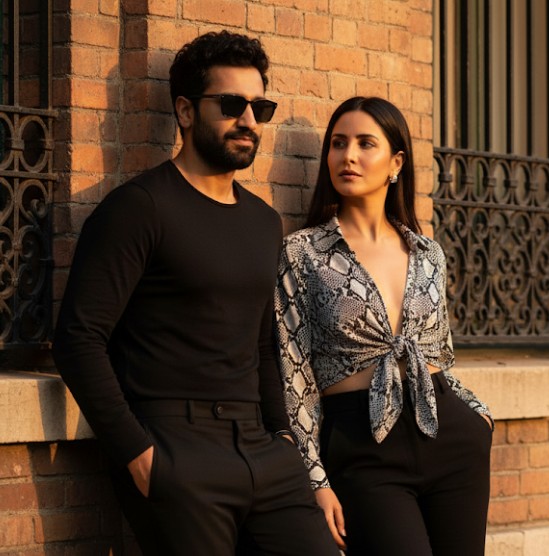 Create an image of a man and a woman posing together in a stylish, urban outdoor setting, similar to a fashionable street style photoshoot. The background should feature a brick wall with ornate black iron details, giving the scene a chic, modern feel. The man should be wearing a sleek black shirt, sunglasses, and black pants, standing confidently while leaning slightly against a structure. The woman should wear a trendy, open-front black blouse with a snake print pattern, tied at the waist, paired with black trousers. She should be looking at him while he gazes at her, both appearing cool and confident. Maintain their facial features as in the uploaded image for authenticity. The lighting should be warm, capturing an early evening golden hour feel.