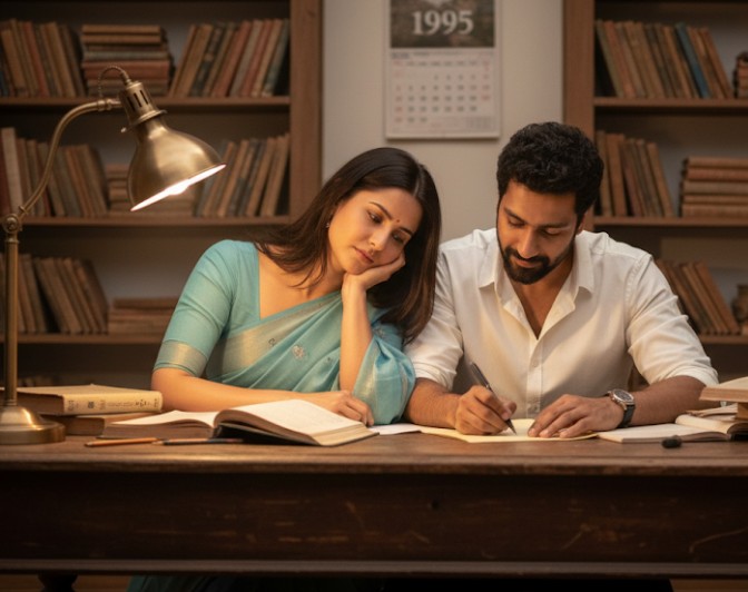 Create an image of a young couple seated at a wooden desk under a warm light from a desk lamp. The girl is wearing a soft, light blue saree, resting her head on one hand, and gazing attentively at the boy who is writing on a piece of paper with a pen. The boy is dressed in a white shirt and is focused on writing. The background features bookshelves with a calendar on the wall showing the year 1995. The lighting should be soft, and the mood should feel intimate and calm.
