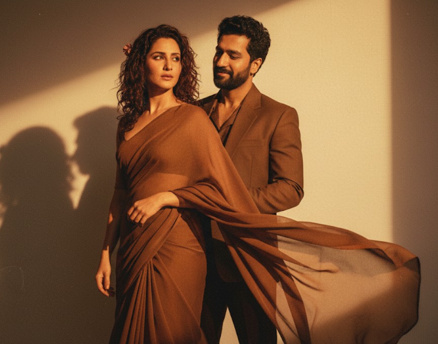 Create a retro vintage grainy but bright image of the reference picture with the girl draped in a perfect plain brown chiffon saree and the boy in a brown suit, Pinteresty aesthetic retro saree vibe, feeling like a 90s movie with dark brown wavy curly hair and a small flower tucked visibly into her curls, romanticising a windy environment; the girl is standing against a solid wall with deep shadows and contrast drama, creating a mysterious and artistic atmosphere where the lighting is warm with golden tones evoking a sunset or golden hour glow, the background is minimalist and slightly textured, and the expression on her face is moody, calm yet happy and introspective.
