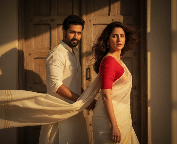 Create a retro, vintage-inspired image – grainy yet bright – based on the reference picture. 510 The girl should be draped in a perfect off-white cotton saree with a red blouse. Pinterest-style aesthetic saree. The vibe must capture the essence of a 90s movie dark brown-haired baddie, enhanced by a windy, romantic atmosphere and the guy should be wearing an off white kurta. She stands against an old wooden door, where deep shadows and dramatic contrasts add mystery and artistry to the scene, creating a moody yet enchanting cinematic effect. Make the girl pose like she's walking and looking back while the guy is holding her saree pallu very evidently and the guy should be looking at the girl.