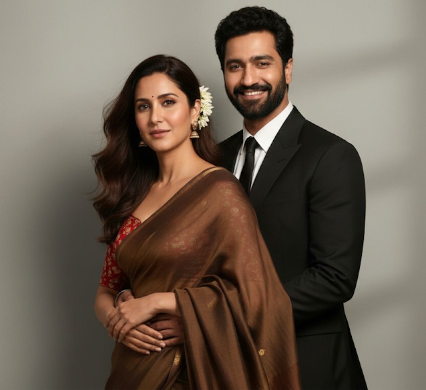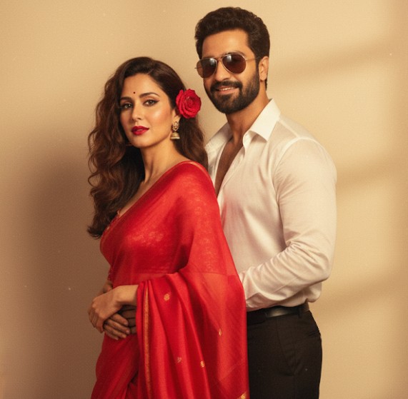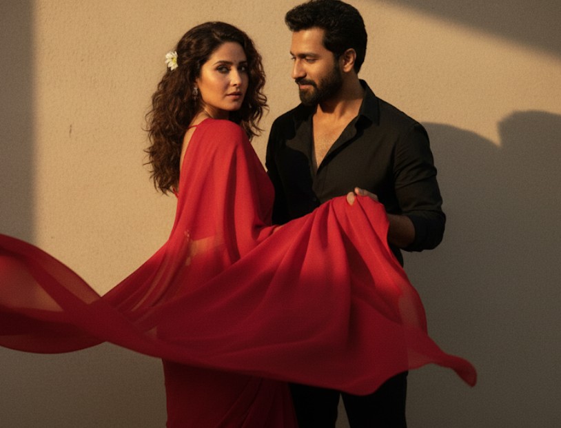 Transform this couple photo into a vibrant retro 90s bollywood-style portrait. The woman wearing a red translucent saree with red rose behind on her right ear and dramatic eyeliner, red lipstick, and voluminous 90s style hair. The man is wearing white translucent shirt, formal pants, and classic sunglasses. The overall mood is romantic and cinematic, with soft glowing light, film grain, and a slightly faded vintage colour palette. The background is plain, warm toned wall, illuminated by a warm light source from the right, creating a distinct, soft edge shadow of couple profile and hair on the wall behind her. The overall mood is retro and artistic wont como foco nel.