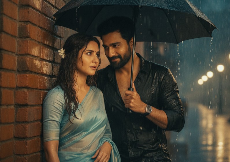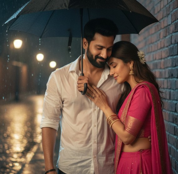 Create a retro, cinematic-inspired image – grainy yet luminous, the girl is draped in a pastel silk saree, slightly wet from light drizzle, clinging softly for a romantic effect. Her hair is loose, slightly messy from the rain, with a single jasmine flower tucked in. She should be standing under a vintage umbrella while leaning against an old brick wall, lost in thought. The man (attached photo) beside her holds the umbrella slightly tilted over her, his shirt slightly wet, eyes fixed on her with a shy laugh, love and care. The street lamps glow warmly in the rain, casting reflections and creating a moody, Bollywood love story atmosphere.