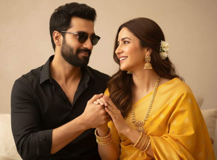 Create an image of a couple sitting close to each other, holding hands, with a warm, soft light effect and a neutral background. The man is wearing a black shirt and sunglasses, and the woman is wearing a yellow saree with matching jewelry, including bangles. The man is looking at the woman with a subtle, affectionate smile, while the woman is looking back at him with a bright, joyful expression. Their faces should be highly detailed and natural, with a genuine connection between them, and the overall feel of the image should be warm, intimate, and light. Ensure that the poses, expressions, and lighting are identical to the reference image provided.